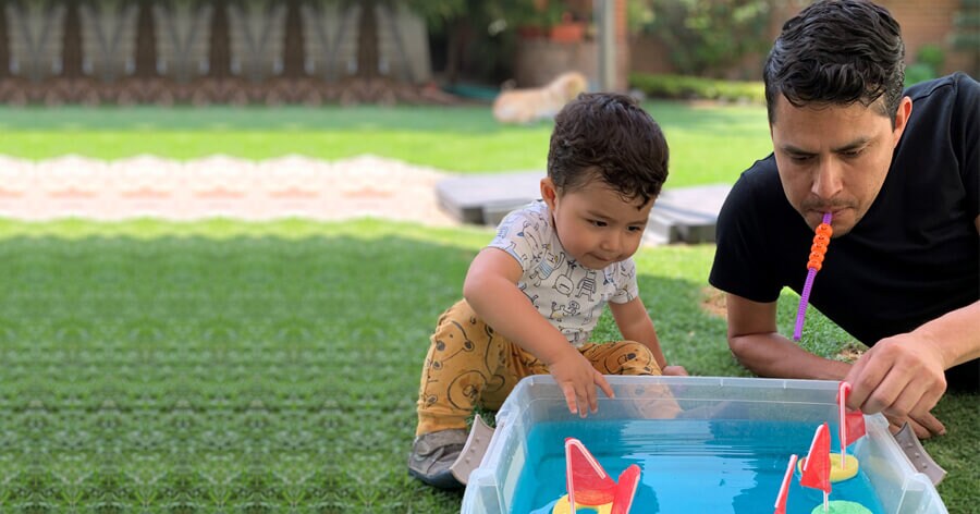 He doesn't speak much yet, but he plays with his laptop toy, simulating working, and says: “Papá, Papá, Papá...”