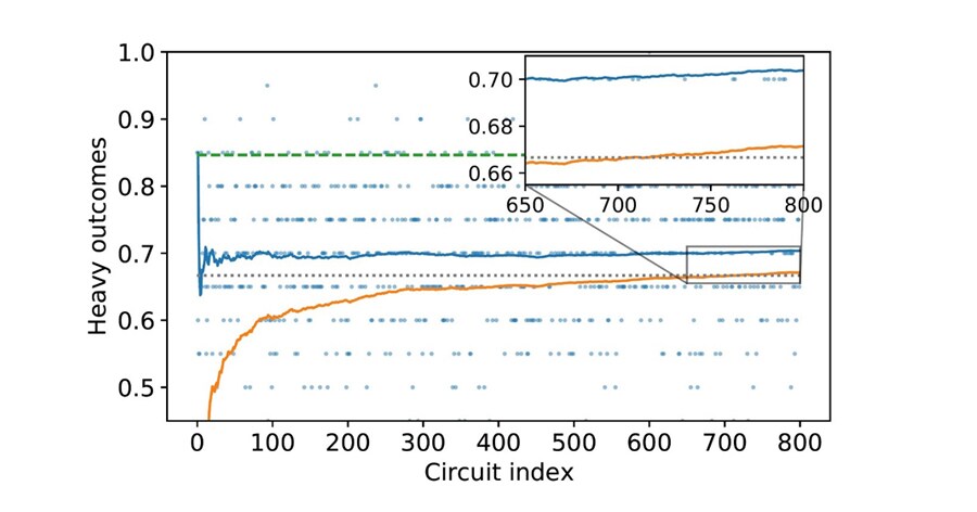 The plot above shows the individual heavy outputs for each Quantum Volume 1024 run. The blue line is an average of heavy outputs and the orange line is the lower 2-sigma error bar which crosses the 2/3 threshold after 707 circuits.