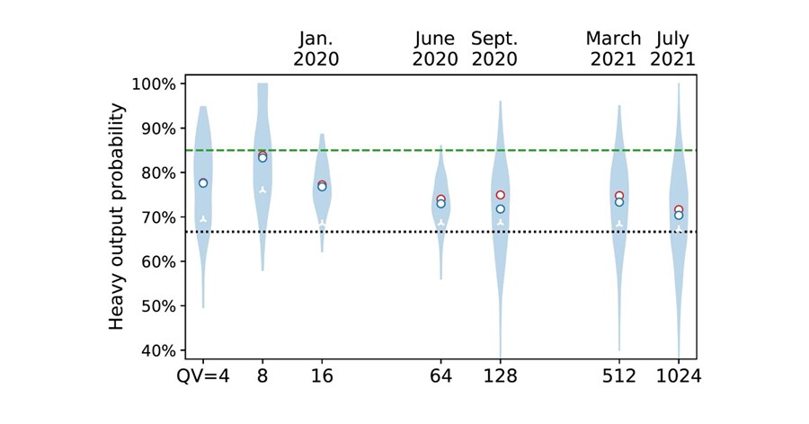 The System Model H1 successfully passed the quantum volume 1024 benchmark, outputting heavy outputs 70.36% of the time, which is above the 2/3 threshold with 98.90% confidence.